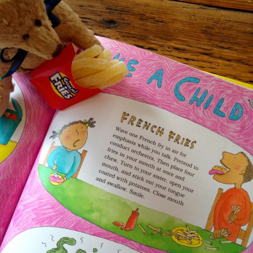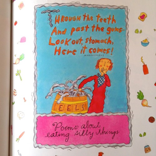 Don’t get me wrong. It’s not all about food. Though there’s a respectable smorgasbord of kooky cuisine, kids will find oodles of other subjects infused with Prelutsky’s signature whackadoodle humor to get them giggling and nodding their heads in recognition — poems about faking illness to skip school, lamenting homework, growing light bulbs in a garden, being allergic to your pets, being forgetful or a chronic complainer, even cautionary quips about squeezing electric eels or being carried away by giant bubble gum (there’s a giant Easter Bunny too).