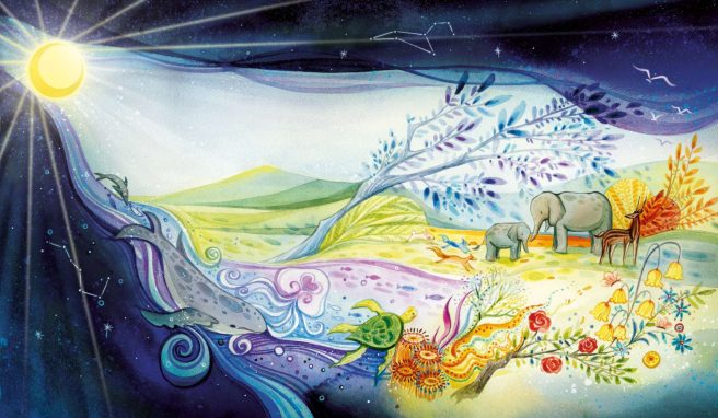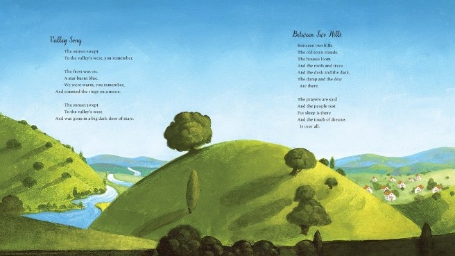 Her verse brims with deliciously informative sensory detail. The weasel is an example of an animal camouflaging itself for protection, while the cardinal’s bright red does the opposite — makes the male stand out to better its chances of finding a mate. Along with glistening frost, a majestic owl listening for underground prey, rustic leaves clinging to their branches, and a pinecone-nibbling squirrel, what a fabulous feast for the eyes!