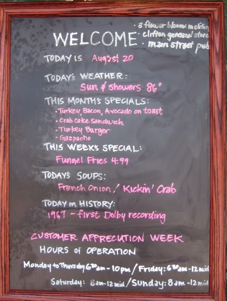 Even if the food had turned out to be just so-so, the place would have been worth seeing, if only to read all the writing on the walls and door frames. I just happen to enjoy a good chalkboard (we have three in the kitchen, one in the dining room).