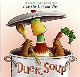 7. Finally, we can’t forget the newest addition to the soup story kettle, DUCK SOUP (HarperCollins, 2008), by the one and only Jackie Urbanovic, who will be here tomorrow!  Maxwell the duck is busy making an original recipe, when he decides something is definitely missing. While he’s out in the herb garden, his friends, Brody, Dakota and Bebe, come to visit. They see a feather floating in the pot, but no Max. Their frantic search for him is hilarious. A great read-aloud!