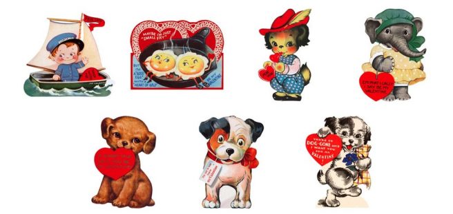 Anyway, a quick scan of vintage valentines (ca. 1950’s) revealed a preponderance of food-related puns. Some are sweet, some are groan-worthy, and some a little strange. Nevertheless, all harken back to a simpler time and are interesting for different reasons. It’s too bad that for the most part, we’ll never know who the artists were behind these designs. Hope you enjoy this little feast from yesteryear!