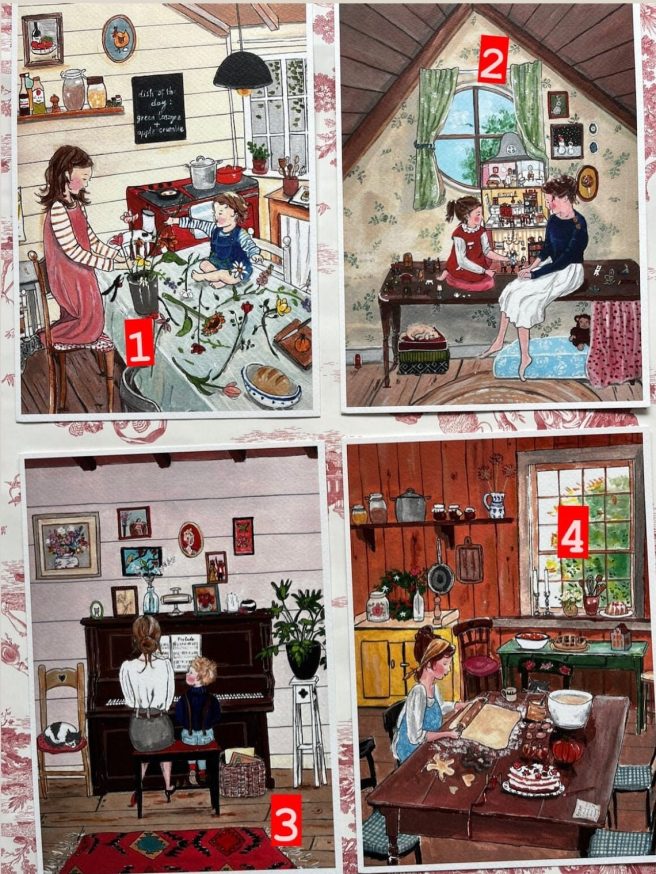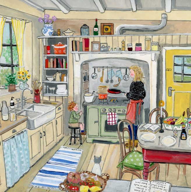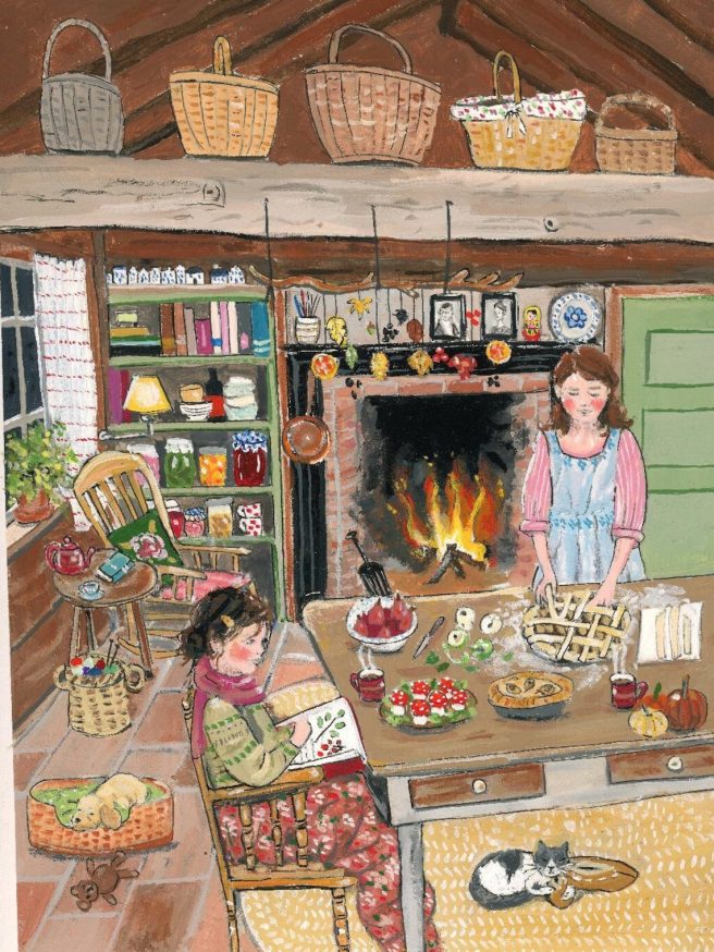 Naturally my favorites are the kitchen scenes, showing families cooking, baking, or eating together. Can’t you just imagine the heavenly aromas of the delicious homemade treats they’re making?