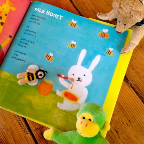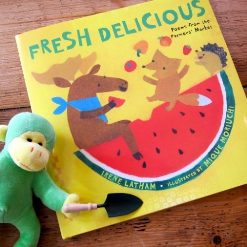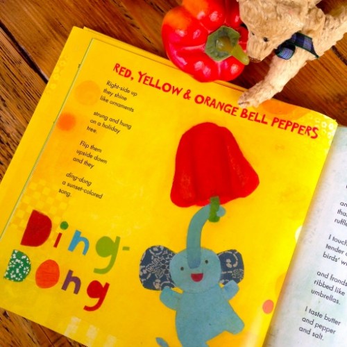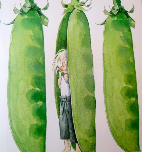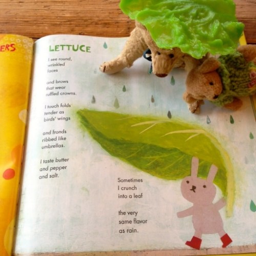 Garden favorites like peas, potatoes, tomatoes, lettuce, cabbage, beets and onions take their place in the sun with playful rhyming verse and Lena’s fanciful pictures. I may as well confess right now that I’ve always had a thing for giant vegetables, so when I saw how Lena fiddled with scale in this book I squealed with delight. 🙂