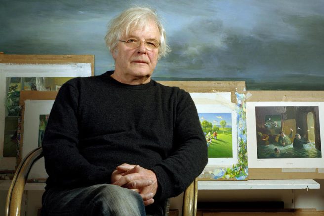 You may remember my featuring his work a couple of years ago, when I mentioned that he usually includes a short poem on the back of his paintings. His ‘old man with dog’ pictures have made his work instantly recognizable and highly accessible.
